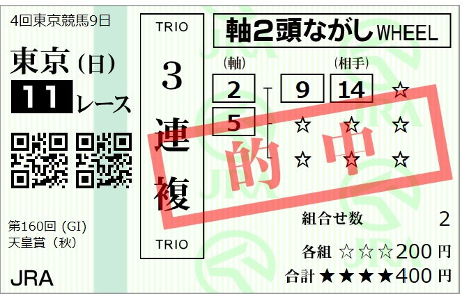 JUGEMテーマ:雲蒸竜変 先週のエリザベス女王杯を優勝したのは3人気?ラッキーライラックで ジョッキーは短期免許で来日していたc.スミヨンでした! しかし、短期免許で来日してすぐにG?を勝ってしまうのですから、外人ジョッキーは やはり馬券から外せません。 2着7人気?クロコスミア、3着に1人気?ラヴズオンリーユーでした。 私の馬券ですが、見事3連複的中。(^^) この日は、「祝賀御列の儀」とい...