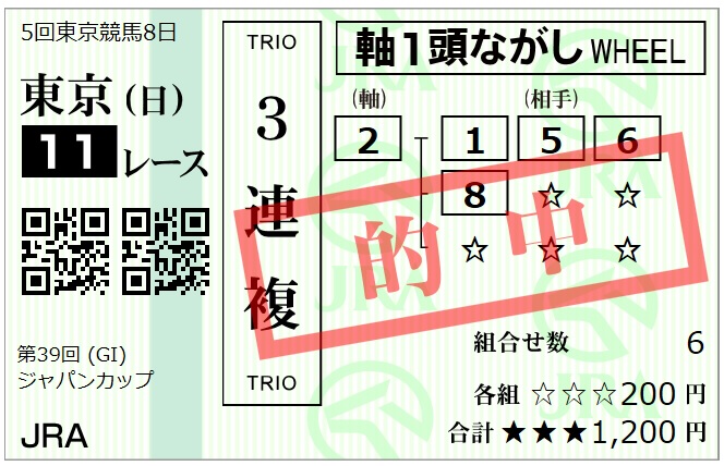 JUGEMテーマ:雲蒸竜変 先週の外国馬不参加のジャパンCを優勝したのは、3人気?スワーヴリチヤード ジョッキーはO.マーフィーでした! 馬場が悪い中、直線で内をつくという騎乗で、やはり外人ジョッキーは強いですね。 2着に5人気3歳牝馬の?カレンブーケドール、3着に私の◎本命2人気?ワグネリアンで 私の馬券ですが、見事安い配当の3連複的中。(^_^) このレースで1枠に牝馬が入ると買いですね! 今回は少し...