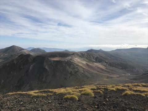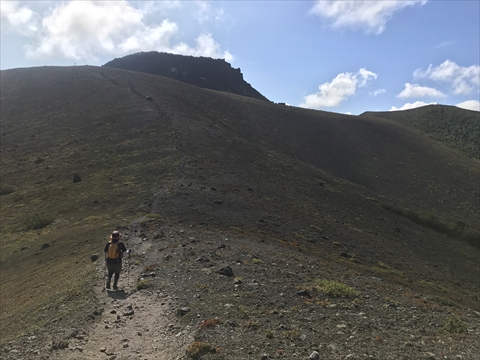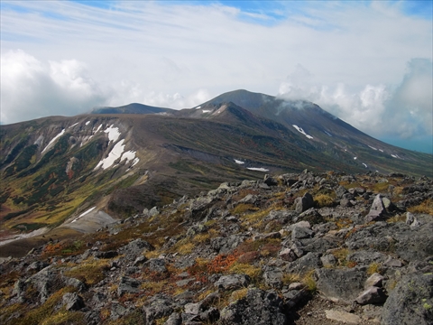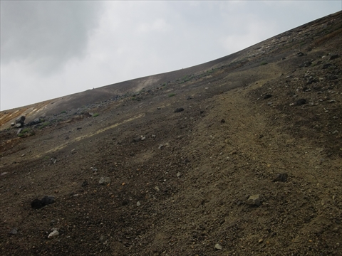 JUGEMテーマ:北海道の登山 しばらく砂礫地を歩いてきたけれど、徐々に足が埋まるようになってきた。 このルートで2番目にキツい急斜面は、滑ってなかなか進まなかった。 登山道が歩きやすくなると、前方に『十勝岳』、背後に『美瑛岳』・『鋸岳』が見えた。 徐々に『十勝岳』が大きくなってきた。 左手に「上ホロカメットク山」を眺めながら、最後の登りを進んだ。 11時26分 『十勝...