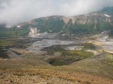 JUGEMテーマ:北海道の登山 『御鉢平』を眺めながら、バウムクーヘン・スポーツようかんを食べた。 この先のコースはお互い何度も歩いているので、別々に行動することにした。 10時30分 『旭岳』へ向けて歩き始めた。 視界は悪く景色を楽しめなかったので、黙々と進んだ。 10時50分 「間宮岳分岐」を通過した。 『旭岳』にかなり近づいたけれど、ガスがかかって全く見えなかった。 雪渓のない登りは、歩きにくくて、全然、楽しくなかった。 ...