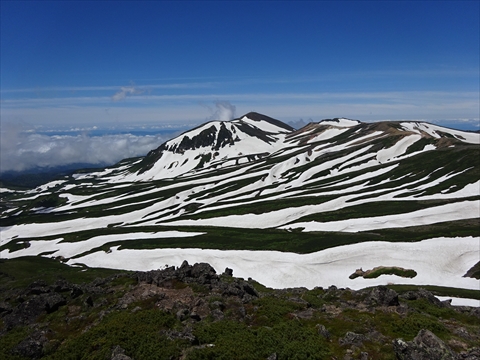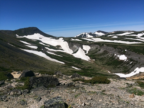 JUGEMテーマ:北海道の登山 昨年から登山を始めた同僚と山へ行く約束をしていたけれど、同じタイミングで休暇を取ることが出来た。 時間を見ながらコースを選択することが出来て、夏場に来たことのない『銀泉台』から登山をすることにした。 準備を終えて、快晴の中 7時25分 登山を開始した。 青空と新緑・雪渓が色鮮やかだった。 ニセイカウシュッペ山は一部雲海が発生していたけれど、山頂付近は天気が良さそうだった。 同僚のペースはわからないので、先行し...
