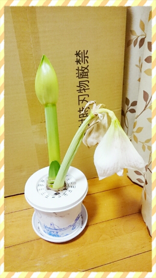 JUGEMテーマ:☆球根植物★ ニンフことアマリリスさん、まぁ〜成長が早い早い。 2つの花が見事に咲いてから5日後。 3つめの花が咲きました!! これまた大きくて立派な花を見事に咲かせてくれまして、 テンションが上がってるわけですが・・・ ちょっとバランスがなんてゆうかその、 傾いてしまって・・・ いや、ちょっとではないなぁ。 だいぶ、茎がグイーンと曲がってしまった。 なんでかしら? お花の重みでこうなったのかしら。 2つ咲いたときは、ほぼ同時に咲いたようなものだから バランスがとれ...