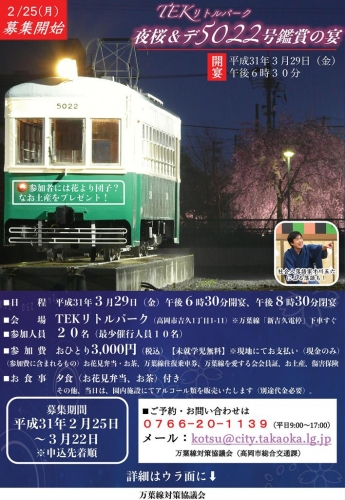 五六です。だんだん春が近づいてきました。 そんな中こちらのイベントで落語をさせていただくことになりました。会場は高岡市吉久のTEKリトルパーク内に展示してある車両の中! 最近、いろいろなところで落語をさせていただく機会が増えましたが、電車の中でというのは初めてなので興奮しています。 先日会場を下見させていただきました。丁度いい広さで、意外とやりやすいかも? と思いました。きっと3月の下旬には桜も丁度よい見ごろになっていると思います! 当日は夜桜と電車がライトアップされる...