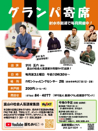 7月の出演報告! 1 サロン落語 今回で4回目になりました、射水市大島地区の高齢者サロンさんでの落語。いつもは、会場備え付けの六角形のテーブルに座らせていただいているのですが、今回はいつもの和室が使えないということで、別の部屋で椅子席になったということだったので、先日の小杉展示館さんでの落語会のために天瀬家小六さんにお借りしたままの高座せっとが手元にあったので、使わせていただきました。夏らしい2席を聞いていただきました。 2 グランパさんは今回で28回目になりまし...