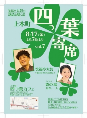 JUGEMテーマ:落語 昨日は・・・ 上本町・四つ葉カフェという 落語好きのマダムが世話人をされている 落語会です。27名で満員。旧わかな寄席ほどの こじんまりとしたスペースです。 「四つ葉寄席〜笑福亭大智の落語を聴く会」 8月10日(金) 19時開演 「壺算」 和泉家遊福 いきなり見たことのないおじさん・・・実は このスペースでは常連の素人落語家です。 落語サークルには所属せず、こうしたプロの会 の前座が活動の中心だそうです。 我々とは真逆の存在ですな。 「南京玉すだれ」 笑福亭大...