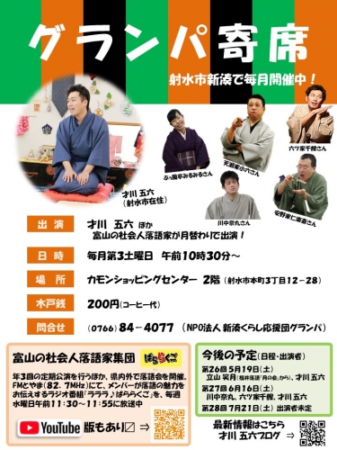 ばららくごメンバーの今後の出演予定です。皆様のご来場を会場でお待ちしています♪(日付順です) 【グランパ寄席〜第26回〜】 グランパ寄席 射水市新湊地区で毎月開催中の落語会です。どなたでもお越しいただけます。 第26回目の開催となる5月の会は、富山県在住ながら福井月の会に所属して活動中の社会人落語家「立山笑月」さんが初登場です。 日時:2018年5月19日(土) 午前10時30分開演(10時開場) 会場:カモンショッピングセンター2階 高...