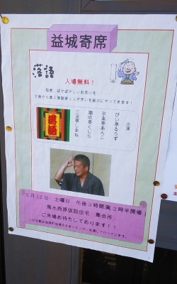 JUGEMテーマ:落語 5月13日(日) 今日は写真を少なめに・・・ ? 赤井仮設住宅 午後10時開演 50軒ほどの規模の仮設住宅です。 昨日とは一転、雨模様でした。 そんな中でも16名もの方々が お越しくださいました。 「つる」 びい亭るうず 「ちりとてちん」 京楽亭あんこ 「代書」 潮吹亭くじら 「猫の災難」 三流亭志まね 志まねさんの「飲みっぷり」 皆様の視線を釘付け ? 平田仮説住宅 午後2時開演 各自治会長さんが、事前にチラシ(るうずさん作成)を 配って下さってますが、当日...