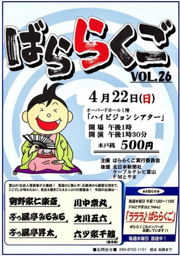 日本中で夏日・真夏日となった、4月22日(日)に富山の社会人落語家集団「ばららくご」の定期公演が開催され、私も出演させていただきました。(私を含め)落語をやったことがないメンバーばかりが集まって、落語をやってみようということで始まったばららくごは、2008年に初回の公演を行い(私は第3回公演から出演ですが)、気がつけばなんと10周年を迎えることができました。 というわけで、今回のばららくごはいつもと違うことがいくつかありました。一つ目は、このとお...
