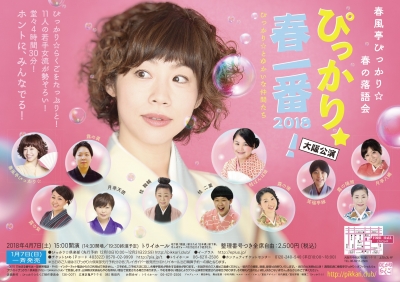 JUGEMテーマ:落語 江戸の人気女流落語家・春風亭ぴっかり☆さんと 10人の上方女流落語家との競演 「ぴっかり☆春一番2018!大阪公演〜ぴっかり☆とゆかいな仲間たち」 4月7日(土) 15時開演 大阪千日前 トリイホール 「オープニングトーク」 ぴっかり☆ ぽんぽ娘 八織 瑞 二葉 鞠輔 天使 陽照 ぴっかり☆さんは「可愛い」「仕事が多い」「性格悪い」!? 「引き出物」 月亭八織 引き出物の鰹節の運命やいかに・・・ 「あくびの稽古」 露の瑞 ぴっかり☆さんとキャラがかぶってる!? 落語...
