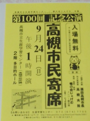 JUGEMテーマ:落語 「100回記念・高槻市民寄席」 9月24日(日)午後1時開演 入場無料 高槻市生涯学習センター2階多目的ホール 番 組 ご挨拶 濱田高槻市長 対談 濱田高槻市長・噺の会じゅげむ 和太鼓演奏 高槻太鼓 落語・漫談・歌謡 噺の会じゅげむメンバー総出演 お囃子:じゅげむ社中 お茶子/志熨家かりん・寿亭さや豆 ・・・・・・・・・・・・・・・・・・・・・・・・・・・・・...