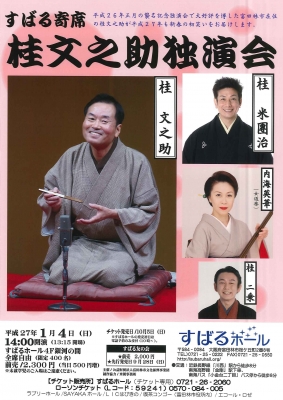 JUGEMテーマ:落語 改めてお知らせします。 「第84回・高槻市民寄席〜吉例顔見世大興行」 1月25日(日)午後2時開演 高槻市立生涯学習センター 1階展示ホール 入場無料(お年玉付き) 番 組 「道具屋」 悠々亭一光 「顔の寸法」 三流亭志まね 「スビバセンおじさん」 高月亭太陽 「茶漬間男」 文々亭小輔 「昭和演芸史」 潮吹亭くじら 「子ほめ」 洋酒家巧駆 中 入 り 「寿限無」 六弦亭ざくろ 「山のあなた」 びい亭るうず 「湯屋...