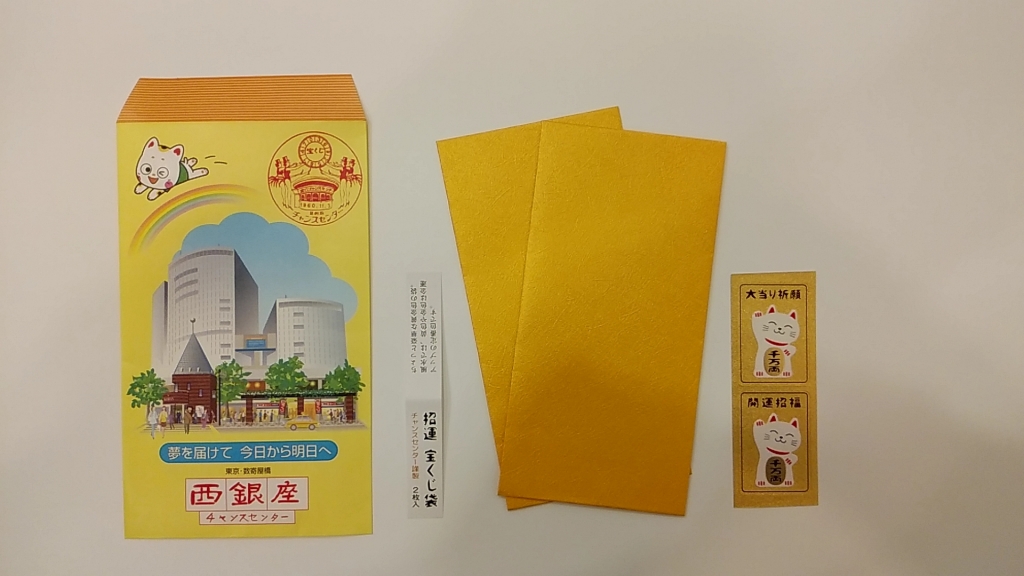 JUGEMテーマ:風水 西銀座チャンスセンターでこんな縁起の良いものに出会えました。日本一宝くじの高額当選の多い宝くじ売り場(平成の高額当選の総額で490億円超がこの売り場からとか)で販売している「宝くじ袋」です。しかも金色で高級感もあり、金運アップしそうです。 二枚入りで、招き猫のシール付きです。 値段は300円。宝くじを購入したら、これに入れて当選発表まで保管すれば。。。 きっと、高額当選に導いてくれることでしょう。 メルカリは、スマ...
