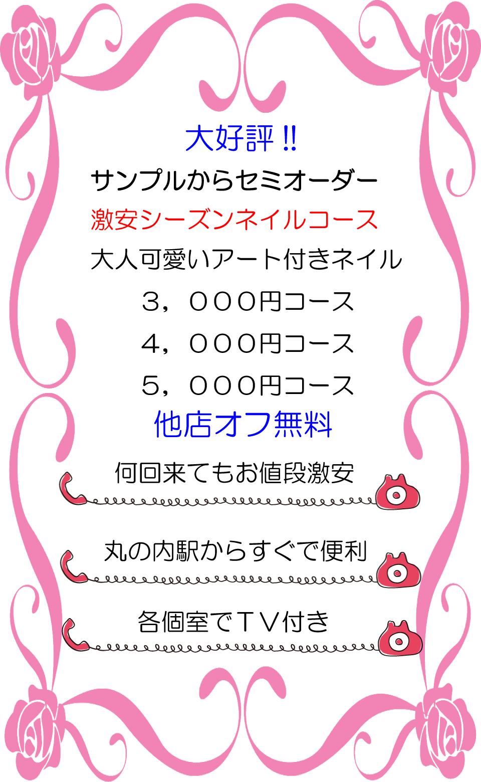 いつでもオフ代無料♪表示価格は すべて税込♪ お値段変わらずいつでも3000円! 本日 4月16日(土曜)14:30スタートのみ予約可 ※当日予約の電話はお早目に・・・ その他、ご予約可能な時間帯のお知らせ 4/17(日)休業 4/18(月)朝10:00-18:00スタート/20:30スタート予約可 4/19(火)朝10:00-21:00スタート予約可 4/20(水)12:00-17:00スタート/20:00スタート予約可 4/21(木)朝10:00-21:00スタート予約可 4/22(金)15:00-21:00スタート予約可 4/23(土)朝10:00-18:00スタート予約可 4/24(日)朝10:00スタート/14:00-18:00スタート予約可 アップネイル052−201−7...