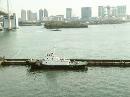 JUGEMテーマ:船と文化 「ゆりかもめ」の車窓から見た、東京湾の風景なのでございます。 あっち!には、お台場に建ちますフジテレビさんの社屋などが見えておりますが。 目の下には、タグボート「やわた」が舫いを取っていると云う情景。 東港サービスさんと云う会社が運航しておいでだとかネット情報には出ています。 此の辺りには。 コンテナ船とか、客船とかが出入りしますので。 タグボートの出番もあると云うコトなのでございましょう。 あっち!には、何かの艀を押しておいでの...