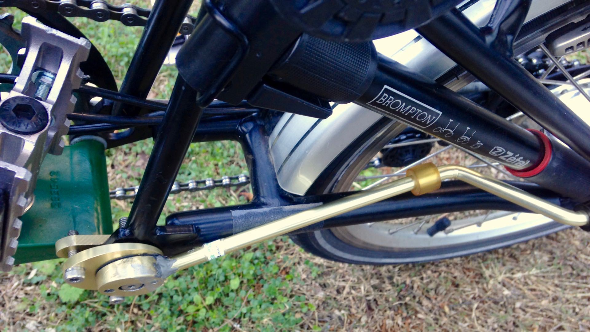 私のブロンプトンには加茂屋のセンタースタンドTactが装着してあるのであるが、取り付け角がどういう訳か斜めになっており、Tactの足の部分がブロンプトンのリアフレームに接触している。その結果としてリアフレームの塗装がはげてしまった。 対策として、頑丈なことで定評のあるコニシのストームガード (50mm幅のもの) をリアフレーム側に貼り付けてあった。しかし、走行中に激しく打ち付けてくるTactはストームガードには少々荷が重すぎたようであり、早くも穴が開きかけている。 そこでストーム...