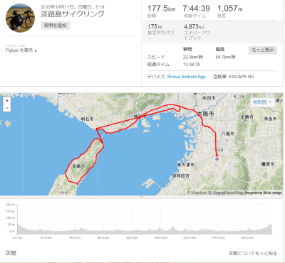 10月11日に友人とサイクリングに行ってきました。 この日は淡路島の北部60km(ほぼ平坦)という初心者向きルートを走る予定だった為、ちょっと物足りなく感じていました。 そこで、堺市の自宅から一緒に走る武庫川の友人宅まで自走し、そこから明石まで友人車に便乗させてもらう作戦を思いつきました。 これで往復70〜80km位追加になるので140km位のほぼ平坦コースと、お腹一杯走れそうだなと考えていました。 そしてサイクリング当日・・・ 色々あって、結局明石まで自走する事になりました。。。 距離にしたら片道75kmです...