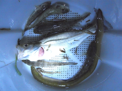 JUGEMテーマ:魚釣り (前編へhttp://usa-una.jugem.jp/?eid=33) 「海でウナギが釣れるか試してみたら・・・(前編)」で、「ポイントが広すぎて難しそう」という曖昧な感想で終わってしまいましたが、なんとなく中途半端に思えてしまい、今日はその続編をお送りすることにします。 前回と同じ漁港でポイントも同じです。 餌は前回の青イソからいつものドバミミズに戻しました。 (ドバは塩水に弱く長持ちしませんでした。結果、海では不適です) 日没直後から外道のハゼが掛かり始め5匹、途中セイゴ1匹、最後にエメラルドグ...