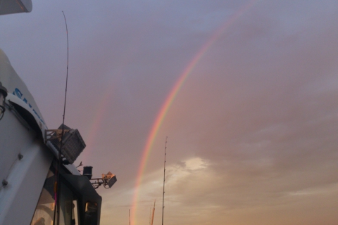 JUGEMテーマ:魚釣り 今季2回目のライケンに行ってきました(・∀・) 行きの高速ではワイパーがきかないくらいのどしゃ降りに遭遇。 船の出船場所に到着した時点でもレインウェアなしでは無理な感じでしたが 暗くなるまでアジ釣りにいそしんでいる間に雨はあがり、空にはきれいな2連の虹が出ました。 夕暮れの海から陸にむかってぴしっとかかる七色のアーチなんて見るの初めて!超きれい! 今日は釣れたんじゃないの?これはいけるんじゃないの? で、暗くなったのでイカ電球点灯でライケン開始。 ポイ...