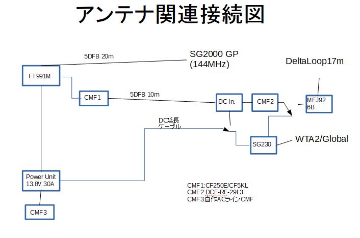 JUGEMテーマ:アマチュア無線 これまで行ってきたコモンモード(ノイズ)対策とその結果について現状をここに記録しておく。 先ずは、全体の接続を示す。 下手な図で申し訳ないが、この図を元に記録していく。 デルタループ17mを展張した時 この時、上の図の、CMF2、CMF3、DC延長ケーブルは無く、ATUの電源は小型トランス式電源を供給ポイントの近くにおいて給電していた。また、5DFB10mは、5D2V20mだった。因みに、アンテナ切り替えポイントからMFJ926Bま...
