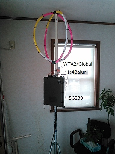 JUGEMテーマ:アマチュア無線 今、こんなの試しています。 直径60cmのWTA2を二つ組み合わせて、十字に構成してみた。球形なのでGlobalと呼ぶ事にする。1エレメント当たりリボンケーブル2回巻き、それぞれのループは並列接続のWTA2だが、二つのエレメントの接続は直列接続としている。 このアンテナの駆動は、平衡と不平衡との両方を試している。(写真は、平衡変換しているバラン付きのもの)コンディションが変化するので、このアンテナしかない小生にはなかなか正確には評...