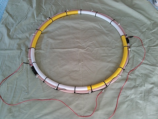 JUGEMテーマ:アマチュア無線 フラフープの骨格 タライアンテナ1号はリボンフィーダーケーブルを巻いただけの構造なので、設置方法がかなり制限される。そこで、フラフープを使って骨格を作ってみた。 フラフープはTOEI LIGHTのスペースフープ。元々フラフープは、同調機構付きMLAのエレメント素材(これに銅箔テープを張る)として探していた。余談だが、最近のフラフープはこのような素直なパイプ形状をしていない。体を刺激するコプがあったり、掴みやすいように一部扁平に整形してあったりし...