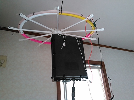 JUGEMテーマ:アマチュア無線 タライアンテナ3号を試す タライアンテナ1号に骨格を装備してから、SWRの調整をしようと給電線のリード線の長さを変化させたが、SWRの改善は見られなかった。1号でのSWRが極端に悪いのは21MHz帯だが、このバンドにはQRVしたいので、この状況を変えたい。 考えられるのはループ本体の長さを変化させること。そこで、2号改のループはそのままに、2号改で使わなくなった給電用だったリボンフィーダーケーブルを利用する事にした。60cm径で4回巻きが可能だった。今度は、直ぐ...