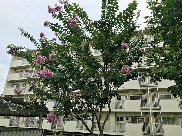 6棟と5棟の間のお庭。 これはなんの木かな… ピンク色の花が咲いております。 木の幹はツルツル… そう… これは「さるすべり」! 猿が登ろうとしても、滑ってしまうということで、猿滑と表記することもある (実際には猿は滑ることなく簡単に上ってしまう)。 出典: フリー百科事典『ウィキペディア(Wikipedia)』 そうか〜、実際は猿はたやすく登っちゃうんだね〜。 じゃ、ホントは「さるすべらない」じゃん。 花...