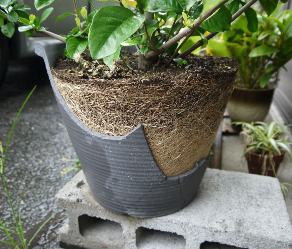 JUGEMテーマ:植物 今日は大阪、朝からずっと雨です。風も強くて、こんな大きな植木鉢が倒れて割れた。 これ、クチナシの木。枝1本からここまで大きくなりましたよ。 青虫に耐えたつぼみが今年は4つ咲きました。 根がこんなに窮屈にはってるのを見てしまうと、もっかい新しい植木鉢に入れるのが可哀そうになって… 我が家を卒業です。 カッパ着て実家に庭に穴を掘りに行きました。 ドラマである雨の山中に死体を埋めに行くシーンを思い出した… 絶対に雨の日はやめた方がいい…たった...