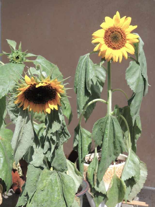 JUGEMテーマ:植物 朝おきて、ひまわりを見るとこんな感じでストライキ状態… 植木鉢が小さいから仕方ないですね。すぐ水をたっぷりあげます。 さっ、飲みなさい、飲みなさい… 朝食を済ませて、もっかい見たらシャッキーン!! わかりやす過ぎて笑えます。 こんな大きな葉っぱを水あげただけで持ち上げるんですもんね…不思議… 去年も同じことブログに書いてたなぁ〜 今日21日は夏至ですね。 夜7時になっても外が明るいのは嬉しい。