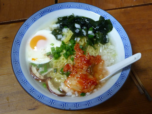 現在、お酢のきいたラーメン作りにはまっている感じです。ちょっと蒸し暑いこの時期にはぴったりの味だと思う。 平塚のご当地ラーメンと言えば老郷(ラオシャン)のタンメンが有名なのですが、そもそもはこの味を再現しようとしたところから始まる。 本来、具はタマネギのみじん切りとワカメだけというシンプルなものなのですが、自分はチンしたタマゴ、キムチ、戻した干しシイタケなどを加えてみた。すっきりした味を邪魔することなく、栄養バランスも整って美味しいです。 では...