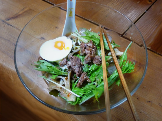 またまた冷たいオリジナルラーメンの記事です。暑い時期なので、温かいラーメンとは別に冷たいラーメンのレシピも考えてみました。 いろいろ試した結果、基本的には水400mLにYOUKI食品のガラスープ(丸どりの方がコクが出る)、久原の白だし、だし塩を各小さじ1、ここに戻した干しシイタケ(刻んだもの数枚)と戻し汁を加えたものを今は冷たいラーメン用の基本レシピにしています。だし塩にはいろいろ種類がありますが、自分のおすすめはタイ塩です。 出来上がったスープですが、ラーメンスープとしてはかなり...