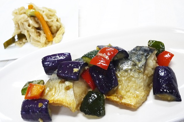 JUGEMテーマ:料理 安心工房のお惣菜セット・無添加手作り「食養御膳」は「主菜と副菜」で1食分、日替わりメニュー「五食分」が入ったお惣菜セットです。 主菜「鯖と野菜のピリ辛仕立て」 副菜「切干大根の含め煮」 ●鯖は食べやすくカットし、下味と粉を付けてこんがりと焼きました。色よく揚げた茄子とズッキーニ・ピーマンと合わせて、細かく刻んだ香味野菜のピリ辛醤油仕立てにしました。 副菜は、和の定番:切干大根の含め煮。工房自慢のかつ...