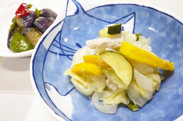 JUGEMテーマ:料理 安心工房のお惣菜セット・無添加手作り「食養御膳」は「主菜と副菜」で1食分、日替わりメニュー「五食分」が入ったお惣菜セットです。 主菜「夏野菜の塩レモン炒め」 副菜「茄子とピーマンの鍋しぎ」 ●平牧三元豚のお肉と五つのカラフル野菜を、回転釜で豪快にチャンプルしました。レモンでサッパリとした味わいの、夏らしいお惣菜になりました。 副菜は、茄子とピーマンの鍋しぎ。茄子を相性のいい油と、名コンビの味噌で調味...