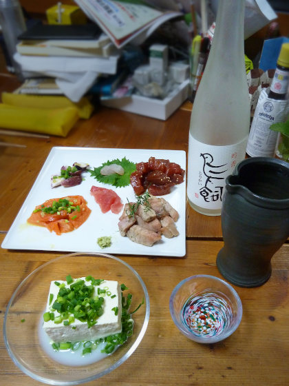 つい先ほど気づいたのですが、もう普通にお店に入って食事するなんて、3月以降は一度もないな。コンビニでおにぎりとかは買ったことはあったけど、基本は家のなかとか、お散歩の途中とか、そんな感じです。その分、これまで以上に自分でお料理する機会が増えたってことですね。 このお造りも自分でつくりました。左からタコとサーモンのカルパッチョ(軽く塩をふり、チューブのニンニクとわさびをオリーブオイルで溶いたものをソースとしてかけました)、シソの上に乗っているのはヒラメ(塩と昆布茶...