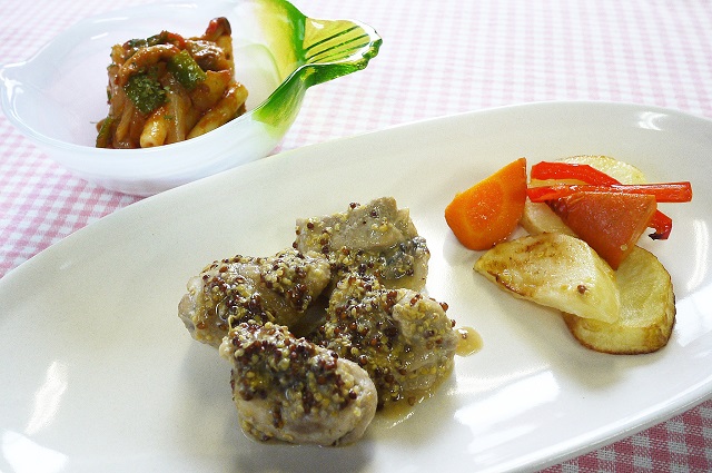 JUGEMテーマ:料理 安心工房のお惣菜セット・無添加手作り「食養御膳」は「主菜と副菜」で1食分、日替わりメニュー「五食分」が入ったお惣菜セットです。 主菜「鶏肉のレモンマスタード煮」 副菜「マカロニナポリタン」 ●菜彩鶏もも肉は下味を付けてサッとグリルし、サッパリとした調味液で煮込みました。マスタードの風味とレモンの酸味がきいた、フランスのお味。ちょっぴりオシャレにいかがでしょうか。 副菜は、マカロニのナポリタン。スパゲ...