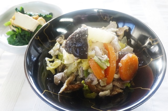 JUGEMテーマ:料理 安心工房のお惣菜セット・無添加手作り「食養御膳」は「主菜と副菜」で1食分、日替わりメニュー「五食分」が入ったお惣菜セットです。 主菜「豚肉の塩麹炒め」 副菜「ほうれん草と厚揚げ煮」 ●三元豚もも肉は丁寧に炒め、たっぷりの白菜・肉厚の椎茸と一緒に塩麹味に仕上げました。椎茸の香りと塩麹のまろやかさ、自然の旨味がたっぷりの一品です。 副菜は、ほうれんそうと厚揚げ煮。ほうれん草を色よく茹で、含...