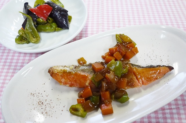 JUGEMテーマ:料理 安心工房のお惣菜セット・無添加手作り「食養御膳」は「主菜と副菜」で1食分、日替わりメニュー「五食分」が入ったお惣菜セットです。 主菜「紅鮭の野菜チリソース」 副菜「なすとピーマンの鍋しぎ」 ●紅鮭は牛乳に浸してしっとりさせてグリルしました。野菜のチリソースをたっぷりのせました。チリソースが鮭に良く合い、御飯も進みます。 副菜は、なすとピーマンの鍋しぎ。なすを相性のいい油と、名コンビの味噌で調味しました。 ...