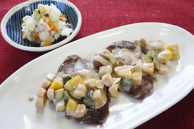 JUGEMテーマ:料理 安心工房のお惣菜セット・無添加手作り「食養御膳」は「主菜と副菜」で1食分、日替わりメニュー「五食分」が入ったお惣菜セットです。 主菜「豚肉のソテー オーロラソース」 副菜「マッシュとお豆の和えもの」 ●平牧三元豚肩ロースを下味のたれに半日漬け込み、粉をつけてサッとソテーしました。まろやかで濃厚なオーロラソースをかけました。 副菜は、マッシュとお豆の和えもの。じゃが芋を蒸してマッシュしたところに、栄養豊富なお豆を加...
