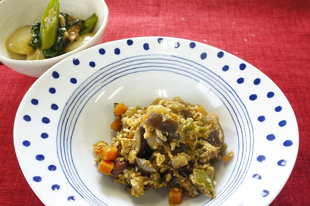 JUGEMテーマ:料理 安心工房のお惣菜セット・無添加手作り「食養御膳」は「主菜と副菜」で1食分、日替わりメニュー「五食分」が入ったお惣菜セットです。 主菜「初秋のドライカレー」 副菜「夕顔のふわネバかけ」 ●鶏肉をミンチにして、秋ナス・ピーマン・いんげん豆・玉ねぎ・人参と一緒に回転釜で豪快に炒め合わせました。御飯にのせてどうぞ! 副菜は、夕顔のふわネバかけ。蒸した夕顔に、栄養豊富で王様野菜のモロヘイヤとオクラを混ぜ合わせ、味噌仕立てに...
