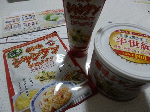 JUGEMテーマ:料理 モラタメで創味シャンタンのセットが当たりました。 正直言いますと、あまり馴染みがない商品だし、メーカーも知らなかったです。 でも、ちょうど缶入りの中華ダシが買いたいと思っていたから、嬉しかったです。 その内容は、創味シャンタンDX 500g/創味シャンタン やわらかタイプ 120g/創味シャンタン 粉末タイプ 50g。