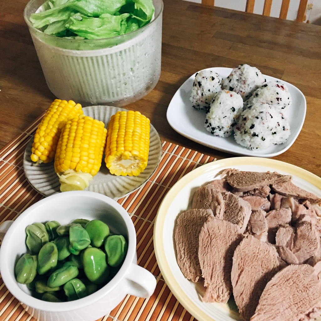 JUGEMテーマ:料理 今日は地域の盆踊り。 娘のヘアセットをして浴衣を着せて。 年に一度の事だから浴衣の着付けは大騒ぎw 夕方過ぎにはグッタリです。 そんな日は手抜きメシ。 茹で豚、茹でトウモロコシ、茹で空豆。 茹で豚はル・クルーゼにお酒とネギの青い部分をぶち込んで煮るだけ。早めに火を止めて後は余熱で火を通します。 それだけなのに驚く程柔らかくなります。 それをキムチと千切りキュウリと共にレタスで巻き巻きして頂きます。 ...