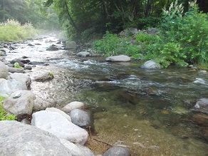 JUGEMテーマ:トラウト 2017年8月5日、本年度2度目の渓流釣行です。 また土曜の釣行ですし、前回けっこう釣り人が多かったので、自宅を午前2時過ぎに出発。 真夏の時期で、やや渇水ですと厳しいかもしれませんが・・・ スタートは、前回良かった二股の下流のポイントから。 それほどの渇水でもない状態です。 ところが、魚が居るだろう流木の際は無反応。 少し下の、大岩の際では予想通りヒット!・・・までは良かったものの、何とバラシ。 これは痛い、とヘコみつつ、釣り下るとようやくヒット。 お腹...