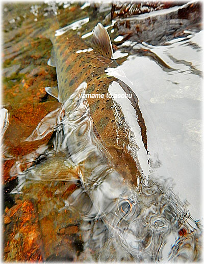 突如、暗い谷間から稲妻が走ったかのように飛び出した 魚影に竿を合わせる。 ヤマメなのか、イワナなのか・・・? 薄暗く、黒い魚体にランディング後、落ち着くまで時間 その正体に迷った。 よく直視してヤマメだと気づく。 良かった 渓相にマッチしたヤマメで。 JUGEMテーマ:トラウト