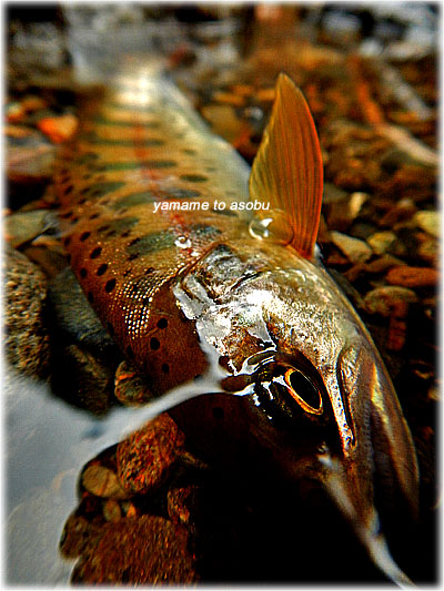 暖かな気温からは想像出来ないほど、 ひと雨後の急激な気温の低下があった日の 朝の出来事。 タフコンディションで迷走している最中のヒットに歓喜! しかし、冷えきったわたしの体もタフコンディションだったようで ヒットに慌て、川の中で思いっきり尻餅状態・・・(汗) 必至でラインだけは緩めず、無事にランディング。 恥ずかしいけど、幸いな出来事でした。 JUGEMテーマ:トラウト