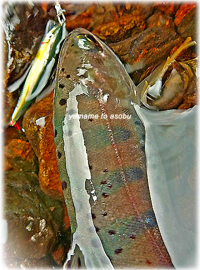 暑かった夏のせい?厳しい釣果に河川を移動ピンポイントで大場所を探って見る。最初に入った河川より魚影反応はあるが、渇水で流れが弱く警戒心からフッキングまで持ち込めない状況下に、やっと出たヤマメ!!ヒットルアーはGoodLuckMinnow50S / アユカラー JUGEMテーマ:トラウト