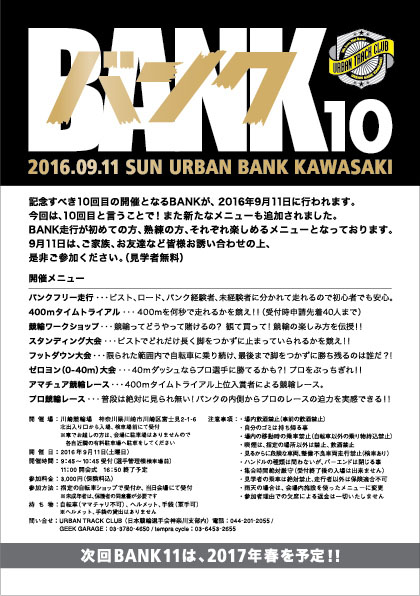 今回で10回目の開催となります、 自分の自転車で競輪場が走れるイベント「BANK」が、9月11日に川崎競輪場にて開催されます。 いつも通りの初心者、経験者、ピスト、ロードに分かれてのフリー走行、 希望者先着によるタイムトライアル、 タイムトライアル上位による一般人競輪レース、 プロ選手によるエキシビジョンレースに加え、 競輪ワークショップ(競輪の見方、車券の買い方をレクチャー)、 スタンディング大会、フットダウン大会、 ゼロヨン(0-40m競争)も開催予定です。 &...