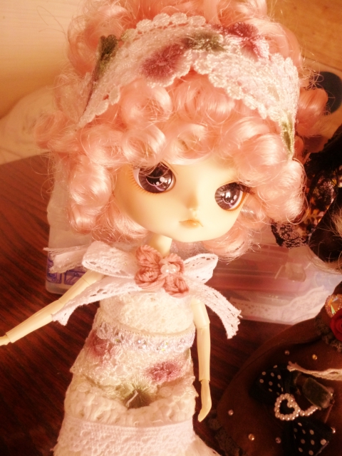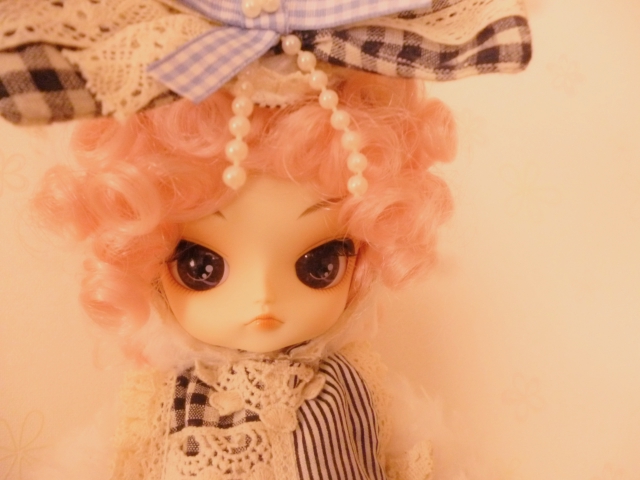 ももちゃんです。 いまアンジュに着せてる服を着ています。 もともとは、 この娘に合わせて 作った服でした。 じつはこれが初期のころに作った服で 基礎など 無かったのですが 材料も百均で、かわいいレースと布がいい仕事してくれたかんじです ほぼ柄や色がカバーしてくれて 可愛く仕上がってくれたかんじです。 髪の色にも似あってました。 この服もはのんのしごとでした。フリマで買った服の布を使用して作りました。 帽子の土台は、羊毛フェルトでいつかが作ってくれました。 そっちのほうは、はのんは...