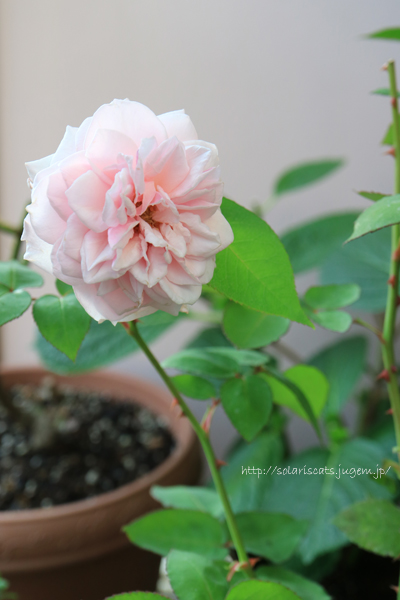今年購入した新苗のうちのひとつ、青バラのブルードレス。 届いたのは5月中旬なので、ちょうど2か月くらい前。 届いたときについていた蕾3つは植え替えの時に全てカット。 そのあと6月、7月とそれぞれ一つずつ蕾をつけたけど、我慢してすべて摘蕾しています。 ひょろひょろと伸びて蕾はつけるのに、脇からの新芽がなかなか伸びてこないので葉っぱは増えないし、今ある葉っぱはハダニの餌食だし。 こんなんで夏超えられるかしらと心配していたら ...