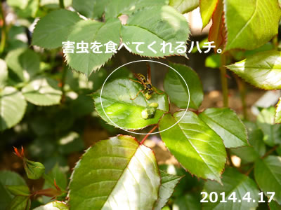 上の写真は害虫を食べている蜂(ハチ)の様子です。 先ほどバラの様子を観察している時に見かけました。 管理人は昆虫に詳しくないので、 写真の蜂がどのような種類のものなのかは分かりません。 ただ、アオムシ(これもどの種類なのかは分かりません…)を 食べてくれているので、バラを育てている人間にとっては 「益虫」と言うことになるのでしょう。 無農薬でバラ栽培をしていると、 虫やクモ、トカゲなどの小動物を見かけることが多くなってきます。 暖かくなってきて、 全ての生き物が活発になってきているの...
