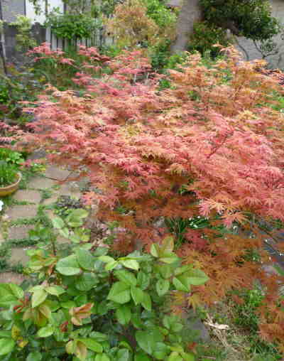 JUGEMテーマ:園芸 2階から見た時赤く写っていたのはこのカエデ。 今一番きれいな時です。 春の初めだけこうして赤く色づきます。 しばらくすると緑の普通の楓になります。 秋は、色づくよりなぜか枯葉になるほうが早くガッカリします。 大きくならないようにカエデもウツギも切り詰めていたら・・ なんとウツギがいじけて枯れてしまいました。...